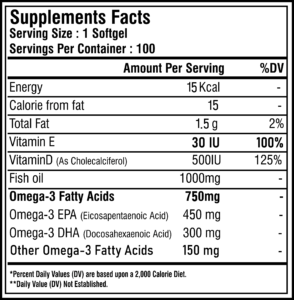 Omega 3 fish oil is a scientifically formulated product containing omega 1000mg with 450mg of EPA & 300mg DHA. In addition, each soft gel has been enriched with vitamin E & D3. It supports your Joint, Heart, Brain, Eye, Hair and Skin.